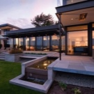 - ملحق منخفض مع مظلة خشبية ضخمة على الطراز الحديث.