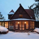 - اتجاهات منزل الجبل شاليه يحتوي على شرفة صلبة خشنة ولكن موثوقة مصنوعة من الحجر الطبيعي والخشب.