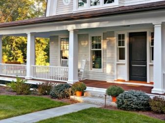 تم بناء الكوخ ، وتم إرفاق الشرفة ، وحان الوقت لإضفاء الجمال على الباب الأمامي حتى يكون من الجيد مغادرة المنزل. بأسلوب بروفانس ، رث شيك ، ريفي ، يتم إخراج الزهور في الأواني على الشرفة – كلما كان ذلك أفضل. إنها تعرض أثاثًا عتيقًا وأرائك وأراجيح مريحة وطاولات وكراسي من الخيزران تجعلك ترغب في الاسترخاء. تم تزيين الشرفة بمظلات جميلة ودرابزين مع أعمدة. تم تركيب شبكة تلميع الأحذية عند المدخل ، وأحواض زهور بجانب الامتداد ، وممرات جميلة تؤدي إلى المنزل.