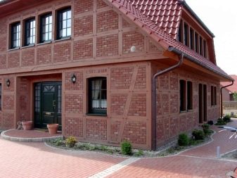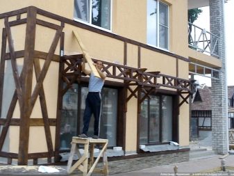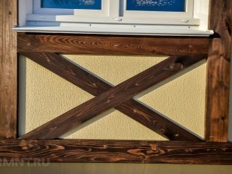 يمكن تزيين المبنى ، الذي لم يتم بناؤه بإطار ، ولكن بأي طريقة أخرى ، مثل منزل نصف خشبي. لهذا الغرض ، يتم تركيب عناصر خشبية أو شبيهة بالخشب على الجدران الملصقة. يتم تنفيذ زخرفة الواجهة من عوارض ملفوفة أو ملتصقة ، وكذلك من عوارض البولي يوريثين التي تحاكي جذوع الأشجار ، والتي تبدو حتى عند الفحص الدقيق وكأنها شجرة حقيقية.