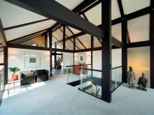 - يمكن رؤية وصلات الشعاع والجمالون داخل المبنى. لا تحتاج إلى تثبيت سقوف ، ولكن تحافظ على جمال الهياكل الخشبية في الداخل..