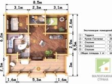العديد من تصميمات المنازل المربعة الجيدة مصنوعة من الأخشاب. على سبيل المثال ، أحد هذه الخيارات له أبعاد 8×8 م. بالمعنى الدقيق للكلمة ، بالإضافة إلى طابق واحد ، هناك أيضًا علية صغيرة. يوفر المشروع ربط شبكة الصرف الصحي وشبكات الصرف الصحي وشبكة الكهرباء. تحت السقف المنحدر لمبنى خشبي من طابق واحد يوجد: