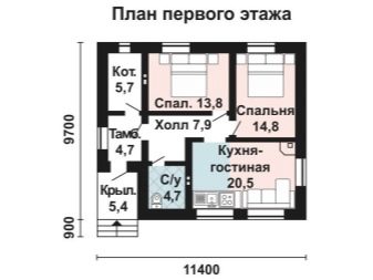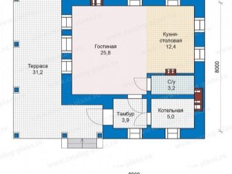 سيتم تجهيز غرفة مرجل بمساحة 8.8 م 2 في الطابق الأرضي. تبلغ مساحة المطبخ حوالي 10 أمتار مربعة. م قاعة المدخل مجاورة لمنطقة الضوء الثانية. حتى أنه كان هناك مكان لحجرة المؤن ومنطقة لتبديل الملابس. الطابق العلوي: