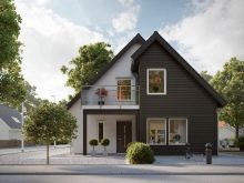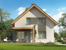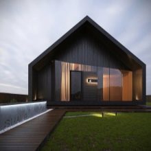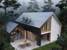 خيار جيد من حيث الأصالة هو منحدر السقف المتغير بشكل حاد.. بشكل عام ، تم تزيين المنزل بألوان رمادية داكنة.. ومع ذلك ، تم تفتيح مجموعة المدخل قدر الإمكان ، مما يضعف المساحة إلى حد ما ويزيل أي تلميح من الكآبة المفرطة. يضيف ملحق الطوب على جانب واحد سحرًا فريدًا. يبدو المبنى جيدًا مقابل الخلفية المحيطة..