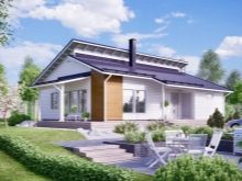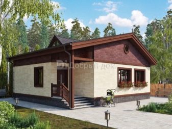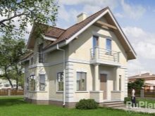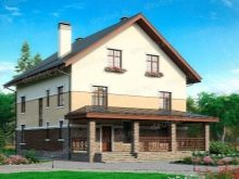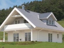 في بعض الحالات ، يميلون إلى اختيار منزل بسقف معدني. في أحد الخيارات ، تبلغ المساحة الإجمالية 116 مترًا مربعًا. م ، منها التراسات والشرفات 31 مترا مربعا. م يتم وضع الجدران المصنوعة من كتل الخرسانة الخلوية على أساس متآلف. المسكن منتهي بالجص من الخارج.