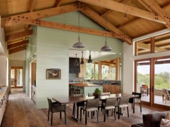 خيار مثير للاهتمام هو أن غرفة واحدة كبيرة تجمع بين غرفة المعيشة وغرفة الطعام والمطبخ.. غرفة النوم هي المساحة الوحيدة المعزولة في المنزل بأكمله. يقع عادة في غرفة زاوية هادئة. يتميز التصميم الداخلي بغياب الأشكال الهندسية المختلفة. يحتوي المبنى على الحد الأدنى من الحواجز حتى لا تشوش المساحة.