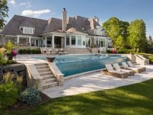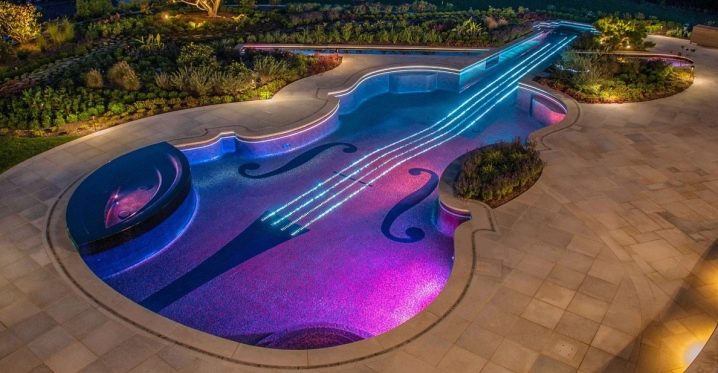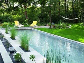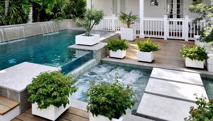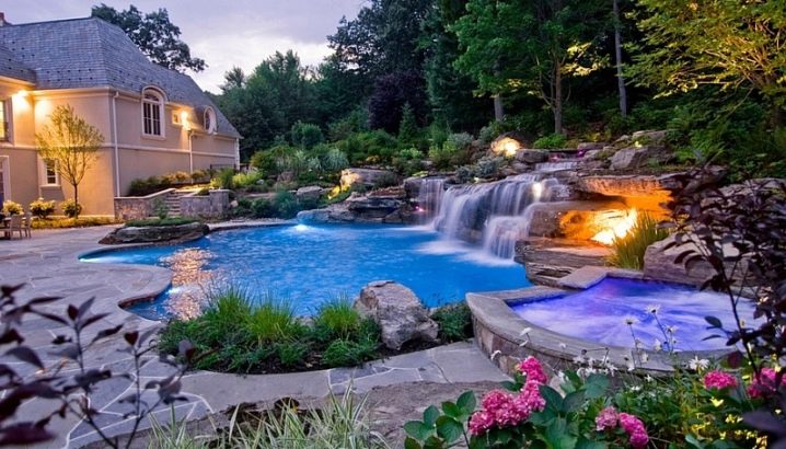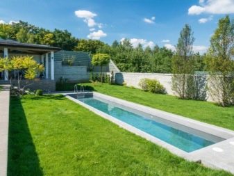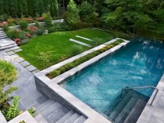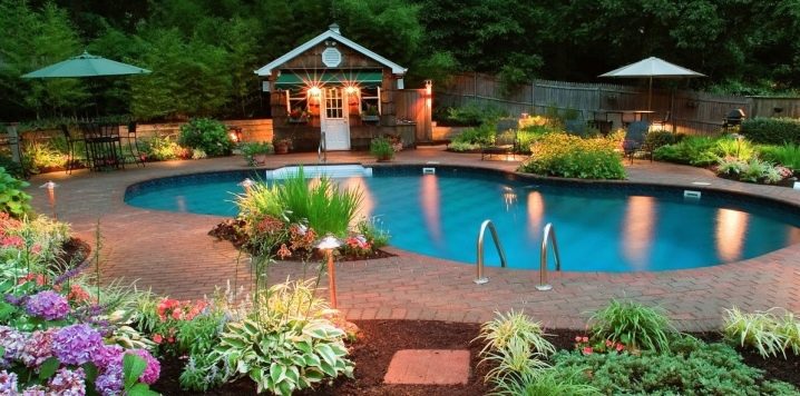 تبدو أحواض السباحة المبنية خارج المنزل أكثر روعة ، لأنها مزينة ليس فقط بالمواد الحديثة ، ولكن أيضًا بنباتات جميلة ، ممثلة بشكل مثالي من قبل مصممي المناظر الطبيعية.