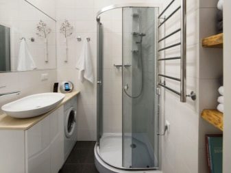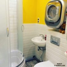 خيار اخر – قم بإزالة الحمام ووضع كبينة استحمام بدلاً من ذلك – في هذه الحالة ، يتم توفير مساحة معينة ليس فقط لوضع الغسالة ، ولكن أيضًا للأثاث الآخر. يمكنك وضع الغسالة الأوتوماتيكية تحت الحوض بين حوض الاستحمام والمرحاض. إذا قمت باستعارة جزء من الممر ودمجه مع غرفة صحية ، فيمكنك تجهيز مكان مناسب فيه لغسالة الملابس..