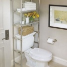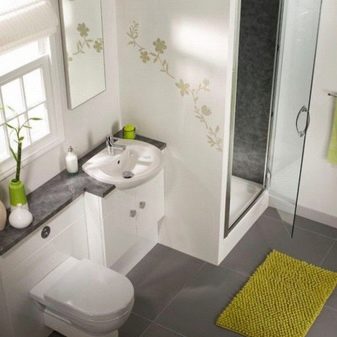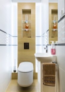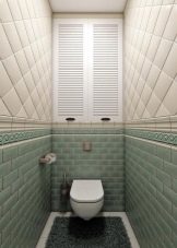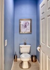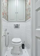 في الزاوية المجاورة للمرحاض ، يمكنك وضع مجموعة أدوات تنظيف وعاء المرحاض ، وتعليق خزانة حائط على الحائط لتخزين الأشياء الصغيرة الضرورية ، وإصلاح حامل ورق التواليت. يُفضل استخدام نظام الألوان على الباستيل ، حيث تعمل الألوان الفاتحة على توسيع مساحة الغرفة بصريًا.