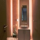 بسبب مساحتها الصغيرة وصغيرة الحجم يتطلب الحمام تصميمًا أكثر تفكيرًا من حيث التطبيق العملي والاختيار الكفء لمواد التكسية والتشطيب.