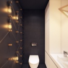 للإضاءة الكاملة لمساحة صغيرة ، يكفي مصباح سقف واحد. يمكنك تثبيت إضاءة موضعية على السقف والجدران ، إذا رغبت في ذلك ، قم بتعليق الشمعدان. كديكور ، ضع سجادة مشرقة ومتناقضة على الأرض ، يمكن أن تكون ناعمة أو زغبية. ضع حامل ورق التواليت الأصلي ، طقم تنظيف المرحاض الأنيق.