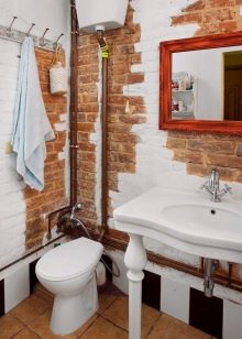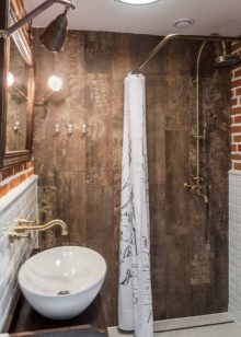 زخرفة على طراز دور علوي – الحل الأمثل لحمام صغير. الأسلوب يعني استخدام مواد بسيطة (الطوب ، الحجر الاصطناعي ، الخرسانة) ، الغياب التام للعناصر الزخرفية. يمكن استبدال المواد كبيرة الحجم في غرفة صغيرة بالبلاط بتقليد الحجر والطوب. ستبدو الغرفة قاسية وصارمة.