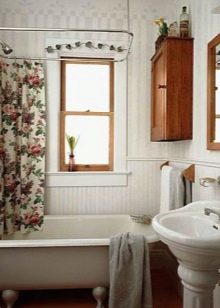 بروفانس – إنه دائمًا الراحة والوئام في كل شيء. يحب الأسلوب المطبوعات الزهرية وأنماط التحقق أو نقاط البولكا والأشياء الزخرفية المصنوعة من الخشب. يوصى بوضع سلال خوص مستديرة ضيقة – أنابيب للتخزين في الزاوية أو على طول الجدار ، قم بتعليق حامل الحديد المطاوع الأصلي لورق التواليت.