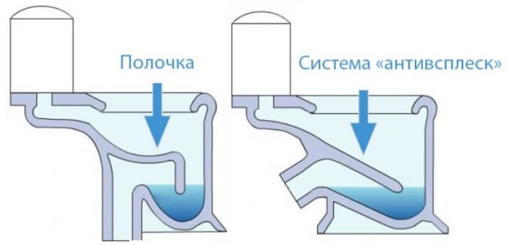 تستحق اهتماما خاصا موديلات بنظام مضاد لتناثر السوائل, التي لم يتم تركيبها في جميع دورات المياه. يتضح وجودها من خلال الهندسة المميزة لفتحة التصريف. يتم إزاحته إلى الجانب ، لذلك يكون عمود الماء صغيرًا. هذا يقلل بشكل كبير من كمية الرش..