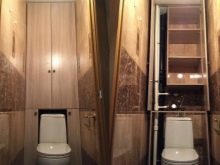 غالبًا ما تظل المساحة الموجودة في المرحاض خلف المرحاض غير مستخدمة ، على الرغم من حقيقة أنه من الأنسب تنظيم التخزين. من السهل جدًا صنع الأرفف والرفوف في هذه المنطقة بيديك..