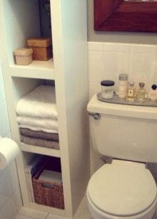 لذلك ، تتمتع الأرفف المفتوحة بالقدرة على توسيع المساحة بصريًا في المرحاض الضيق ، يجب وضعها على جدار ضيق خلف المرحاض. الأمر نفسه ينطبق على المكانة التي تتشكل غالبًا في هذه المنطقة بعد إخفاء الاتصالات. ومع ذلك ، في بعض الحالات ، سيكون من الأصح تركيب أرفف الزاوية ، على سبيل المثال ، إذا كانت غرفة المرحاض ذات شكل غير منتظم..