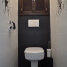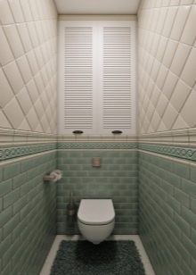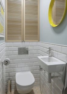 - يبدو الجزء الداخلي من المرحاض جميلًا جدًا ، حيث تم طلاء الجدار خلف الأرفف بظل متناقض. في هذه الحالة ، تبدو الألواح الخشبية البيضاء مفيدة بشكل خاص مقابل اللون الرمادي الداكن. من أجل التخزين على الرفوف المفتوحة لتبدو أنيقة ، يتم استخدام سلال معدنية وحاويات مختلفة للمناشف والأدوات المنزلية الأخرى. بينما توجد الأرفف فوق المرحاض ، يتم تركيب هيكل من اللوح الجصي في الجزء السفلي من الجدار لإخفاء الاتصالات. بنفس الطريقة ، يشكل سطحه العلوي رفًا إضافيًا..