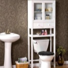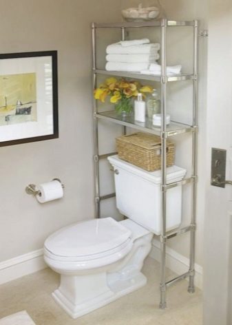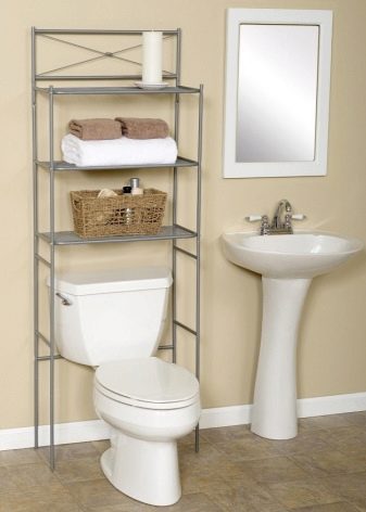 بديل للأرفف التقليدية هو وحدة رفوف مع مساحة خالية في الأسفل.. يتميز التصميم المدمج بأرجل طويلة مستقرة وتبدأ الأرفف فوق الخزان مباشرةً. إنها قطعة الأثاث هذه التي تسمح لك بالتأكيد على النمط المختار للحمام. على سبيل المثال ، الرف الخشبي متعدد الألوان مناسب لغرفة على الطراز الريفي ، والهيكل المعدني سوف يتناسب تمامًا مع نمط الدور العلوي..