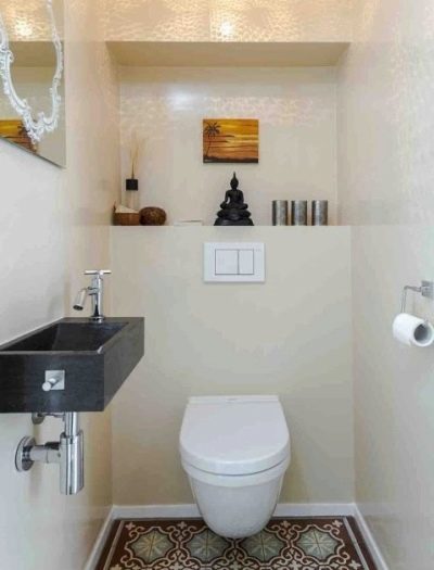 - عندما تحتل مكانة اللوح الجصي خلف المرحاض الجزء الأوسط فقط من الجدار, التصميم الإضافي للأرفف غير مطلوب. في ظل هذه الظروف ، يعمل الجزء السفلي من التجويف كسطح توجد عليه ، على سبيل المثال ، مجموعة متنوعة من الديكور. ومع ذلك ، إذا كانت هناك حاجة إلى مساحة تخزين إضافية ، فيمكن وضع رف واحد أو زوج من الأرفف في نفس المكان المناسب..