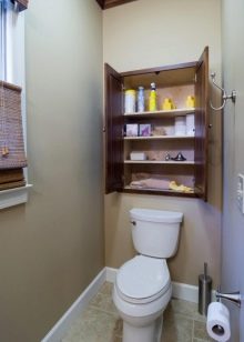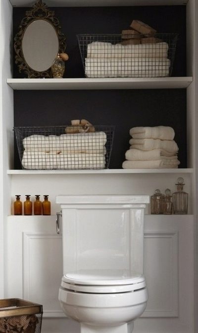 يجب تصميم الأرفف الموجودة في المرحاض خلف المرحاض بهذه الطريقة, بحيث لا تتداخل مع أي شخص ولا تقع في مكان منخفض جدًا ، وكذلك تملأ بعناية المساحة الخالية لغرفة صغيرة. يمكنك تثبيت لوحة واحدة أو زوج من اللوحات أو تجميع رف ، في الجزء السفلي منه سيكون هناك مساحة لخزان.