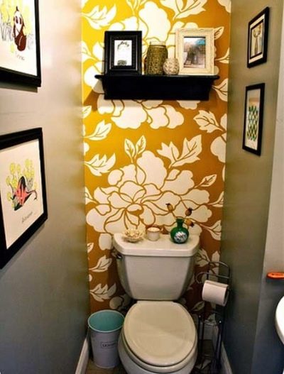 - في حالة وجود مساحة تخزين كافية بالفعل في المرحاض ، لا يمكن استخدام الرف الموجود أعلى المرحاض إلا كوظيفة تزيينية.. نظرًا لأن المظهر الجذاب فقط هو المطلوب منه ، فيجب اختيار أبعاد الهيكل صغيرة ، والشكل أصلي إلى حد ما. علاوة على ذلك ، يتم تثبيت هذا الرف الأسود اللامع على خلفية خلفية صفراء زاهية مع أنماط زهرية ، مما يجعل من الممكن إبراز هذا الجدار في غرفة المرحاض..