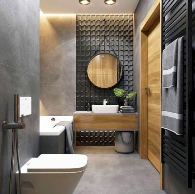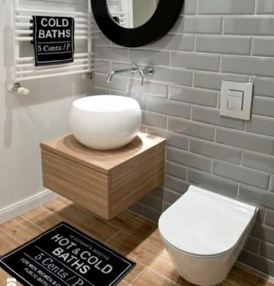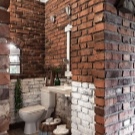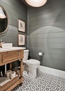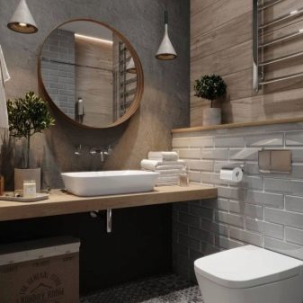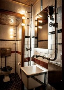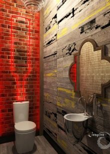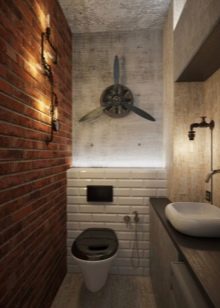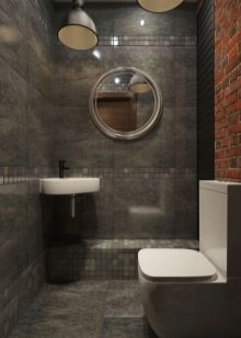 اختيار جيد لتزيين الحمام – أسلوب الدور العلوي. عند استخدامه ، ليست هناك حاجة لإخفاء الأسطح والاتصالات غير المعالجة. ستبدو المعدات الصحية المصنوعة من البورسلين جيدة المظهر على خلفيتها. يحظى هذا النمط بشعبية كبيرة بين الشباب ، وهو مناسب لتزيين أماكن مختلفة ، بما في ذلك المرحاض. تزيين الغرفة بلوحة رمادية. يمكن لصق الجدران أو لصقها بورق حائط متحفظ. يمكن أن يصبح تقليد جدار القرميد من المعالم الداخلية..