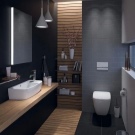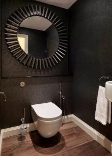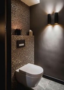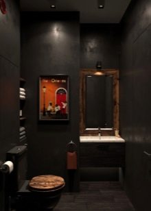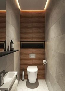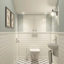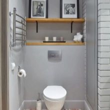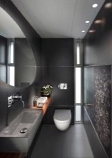 في الحد الأدنى من التصميمات الداخلية فقط الأثاث الضروري موجود. إذا كان المرحاض صغيرًا ، فلن يتم تثبيت سوى وعاء المرحاض ورف صغير بمفصلات. على مساحة أكبر قليلاً ، يتم وضع حوض به خزانة مدمجة ومرآة. يجب أن تكون الزخرفة مقتضبة ، وتعطى الأفضلية للخيارات أحادية اللون.