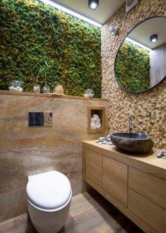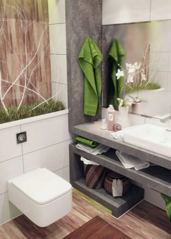 من بين الملحقات في التصميم البيئي ، يتم استخدام سلال من الخيزران والألواح الأصلية المصنوعة من الفروع المجففة. لكن لا يجب أن تفرط في الديكور في الحمام الصغير..