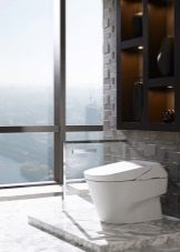 لا يمكن استخدام الأسلوب عالي التقنية في تصميم المرحاض إلا إذا لم تكن مساحتها صغيرة جدًا.. يتم تنفيذ التصميم بشكل أساسي بدرجات اللون الرمادي ، والجمع بين هذا اللون مع الأسود والأبيض. يتم اختيار الأثاث بشكل مريح ، مع تصميم مقتضب وحجم صغير. يمكن تنفيذ وظيفة الديكور بإضاءة LED.