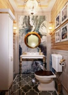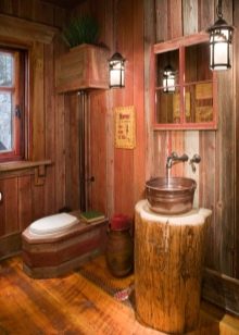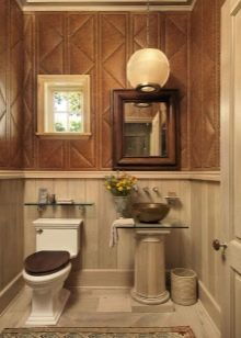 السمة الرئيسية لتصميم الشاليه يتكون من الاستخدام الوفير للخشب الطبيعي والألوان الدافئة. غالبًا ما يتم اختيار هذا الاتجاه للبيوت الريفية ، لكن من الواقعي ترتيب مرحاض يقع في شقة في المدينة. من الأفضل عدم إنهاء الجدران بالخشب الطبيعي: تحت تأثير الرطوبة العالية ، سوف تتدهور بسرعة. تقليد الخشب بألواح أو ورق حائط. اختر الأثاث الغامق.