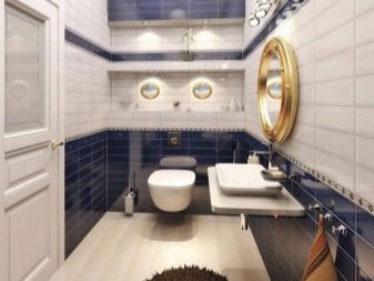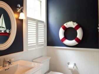 يعتبر التصميم البحري مثاليًا للمرحاض ، حيث تم إنشاؤه بألوان الأبيض والأزرق. تتم الزخرفة على أساس بلاط السيراميك. يمكن تزيين أحد الجدران بلوحة موضوعية.