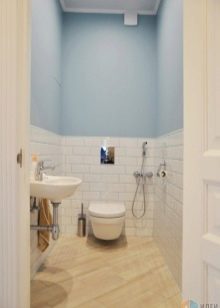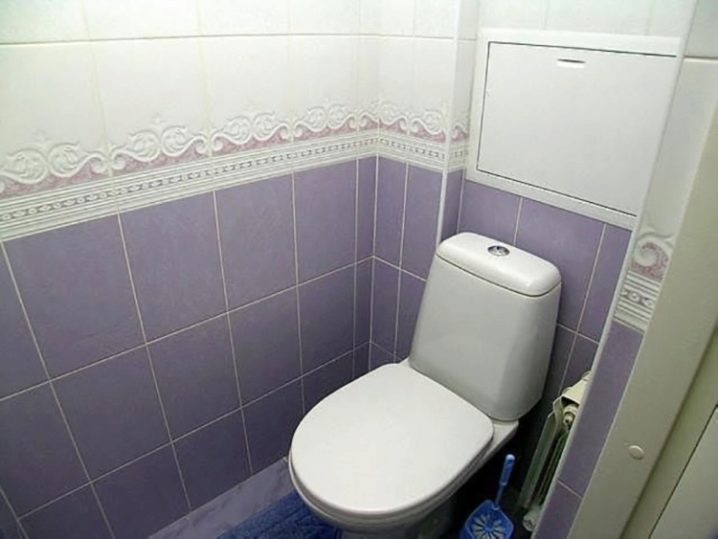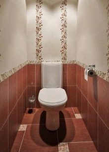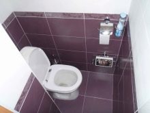 - سيبدو المرحاض بسيطًا ولذيذًا فيه تم الانتهاء من الجدران ببلاط أرجواني فاتح وأبيض. بين المواد ذات الألوان المختلفة ، يمكنك تثبيت حدود زخرفية أو التقاط بلاطة مبدئية بفواصل مرسومة (خطوط منقوشة). من الأفضل وضع البلاط على الأرض وليس الأبيض ، ولكن الأرجواني. يوصى باختيار السباكة باللون الأبيض الكلاسيكي..