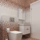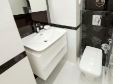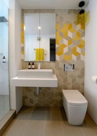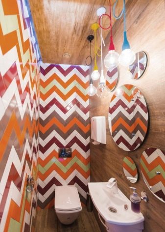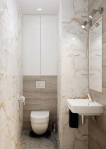 على خلفية تشطيب مماثل ، من الأفضل تثبيت وعاء مرحاض أبيض تقليدي وخزانة بيضاء مثبتة على الحائط مع مغسلة. سيكون هناك ما يكفي من التفاصيل الملونة هنا..