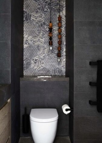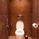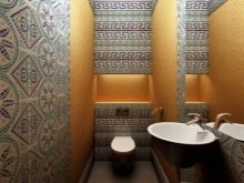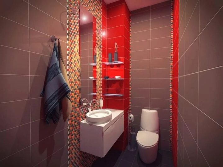 - لكسوة الجدران والأرضيات في المرحاض ، يمكنك الاختيار بلاط بألوان غير عادية. على سبيل المثال ، ستبدو العناصر الكبيرة المستطيلة ذات الظل البني الداكن ، إلى جانب إدخالات مميزة من البلاط الأحمر الغامق والفسيفساء متعددة الألوان المحيطة بالمرآة ، مذهلة..