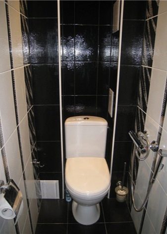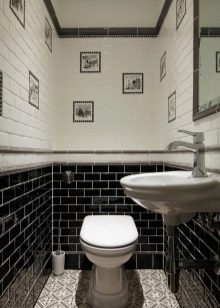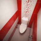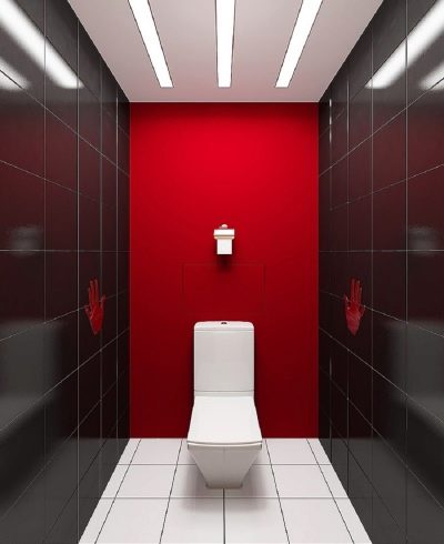 - إذا كنت تحب التصميمات الداخلية الحديثة ولا تخشى التجربة ، يمكنك ذلك “تشغيل” بألوان متباينة, الانتهاء من الجدران الطويلة ببلاط أسود لامع ، واستكمل الجدار الضيق خلف المرحاض الأبيض بمادة حمراء غنية (الطلاء أو ورق الحائط المقاوم للماء مناسب). في نفس الوقت ، يجب أن تكون الأرضية والسقف أبيض..