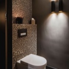 لمنع الجو من أن يبدو مملًا ورتيبًا ، يمكنك تثبيت شريط عالٍ من البلاط الأسود مع طبعات ذهبية سرية على الحائط خلف المرحاض..