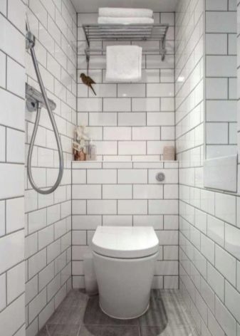 - في الحمام الصغير ، سيكون الحل المربح للجانبين زخرفة الجدار ببلاط حليبي. يمكن وضع البلاط البني الداكن المتباين على الأرض.