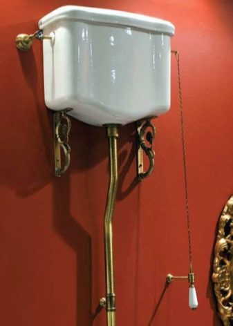 عمل السهم وفقًا لمنطق مماثل. – نظام آخر لغسل المياه في المرحاض ، والذي لم يعد يستخدم في الغالب على نطاق واسع. في هذه الحالة ، تم تمثيل آلية التصريف الموجودة على السطح العلوي للخزان بمقبض دائري ، كان لا بد من سحبه لأعلى – ونتيجة لذلك ، تم فتح صمام في أحشاء الجهاز وسمح للماء بالتدفق على النحو المنشود..