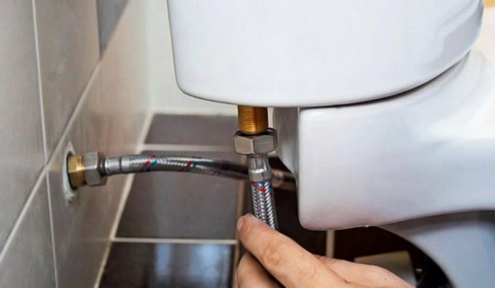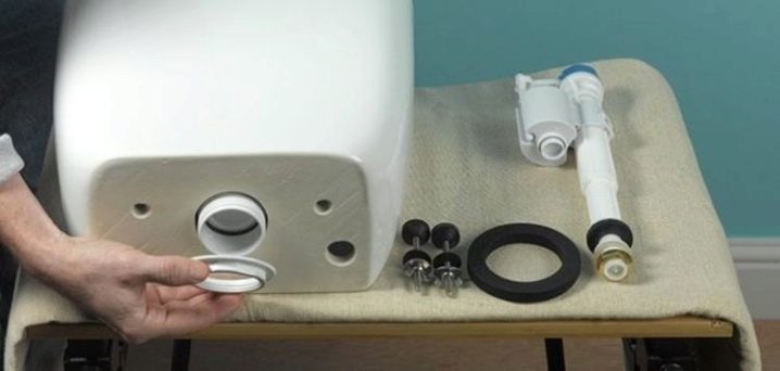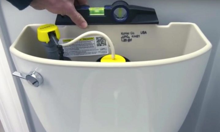 - يتم تثبيت التركيبات المجمعة في خزان المرحاض ، ويتم توصيل الأنبوب الجانبي. تتم العملية باستخدام حشيات لضمان إحكام الغلق.