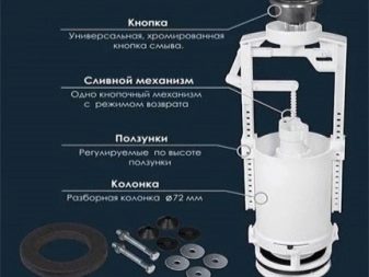 لتفكيك نظام التدفق الداخلي للمرحاض ، يجب عليك ذلك تحديد نوع الآلية. في أغلب الأحيان هناك نماذج مع غير مرتبطة أو زر مزدوج. وإذا كان تشغيل زر واحد واضحًا ، فقد تنشأ أسئلة حول وظيفة النظام المزدوج. الحقيقة هي أن الزر المزدوج ينظم حجم المياه التي يتم تصريفها ، وهو أمر عملي واقتصادي للغاية. على الرغم من أنه يجب أخذ نظام الصرف في الاعتبار ، إلا أن بقية الأجزاء المتجمعة هي نفسها ، وسيكون أسلوب العمل معهم هو نفسه.. يبدو تكوين مجموعة نظام الصرف على هذا النحو.
