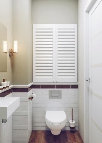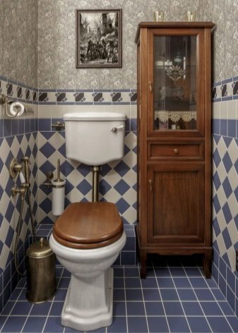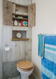بالنسبة للمرحاض الصغير ، عادة ما يتم اختيار المنتجات ذات اللون الباستيل. سيؤدي اختيار الخزانات البيضاء أو البيج أو الزرقاء إلى تكبير الغرفة بصريًا وإضافة مساحة. ستبدو هذه المنتجات مثالية في الغرف المصممة على طراز بروفانس. سوف تتناسب النماذج أو الخزانات المصنوعة يدويًا المزينة باستخدام تقنية decoupage تمامًا مع مثل هذا التصميم..