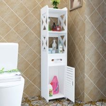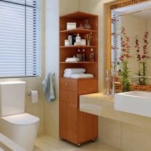 غالبًا ما يكون الحمام صغيرًا ، لذا من الأفضل اختيار الخزائن ، وكذلك الأرفف المفصلية الضيقة أو مقلمة الزاوية الصغيرة التي لا يزيد عرض الرف عن 20 سم.. يمكن أن يختلف عمقها من 35 إلى 60 سم ، ومن الأفضل ألا يتجاوز ارتفاع المنتج الذي يحتوي على 2 أو 3 أرفف 70 سم.