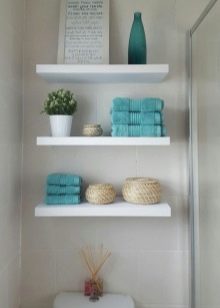 - أرفف مفتوحة. يتم استخدامها في كثير من الأحيان لوضع الديكور. على سبيل المثال ، على مثل هذه الرفوف ، يمكنك وضع مزهريات بالورود أو سلال من الخوص ، وكذلك أنابيب بها كريم ، وصابون سائل ، وشامبو. يُنصح باستخدام النماذج مع التثبيت للغرف المصنوعة بأسلوب معين. من الأفضل تعليقهم فوق المرحاض..