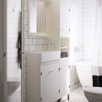 - يجب اختيار هذا الأثاث مع مراعاة حجم الغرفة الصحية.. لذلك ، بالنسبة لدورة المياه الصغيرة ، يُنصح باختيار تصميم صغير أو مقلمة ضيقة.