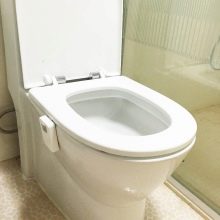 باستخدام حافة مرنة ، نقوم بتثبيت الجهاز على هيكل المرحاض ؛