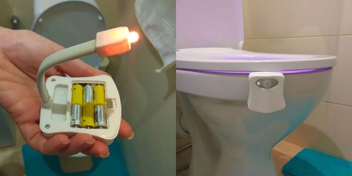في المظهر وطريقة التعلق ، تشبه هذه الهياكل الجهاز الذي يتم من خلاله تغذية الصابون في وعاء المرحاض. الإضاءة الخلفية تعمل بالبطاريات. يختلف عددها ونوعها حسب طراز هيكل الضوء. في معظم الحالات ، يتم استخدام ثلاث بطاريات. تحتوي جميع الإضاءة الخلفية على جهاز مشابه يتكون من عنصرين فقط: