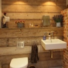 - غرفة واسعة يسمح لك بوضع سباكة إضافية. يمكن أن تستوعب أرفف الحائط وطاولة السرير كل ما تحتاجه. تعمل الأسطح الخشبية والحجرية معًا بشكل جيد. إضافة جيدة – مصابيح ومرآة.