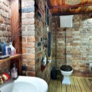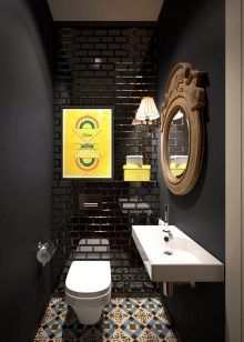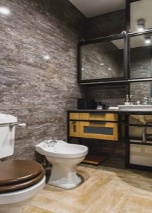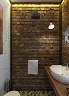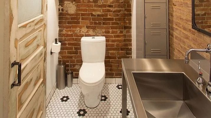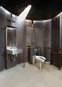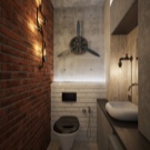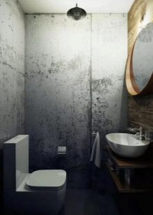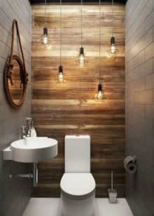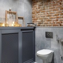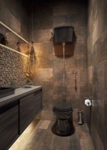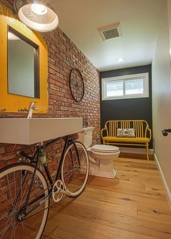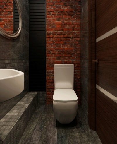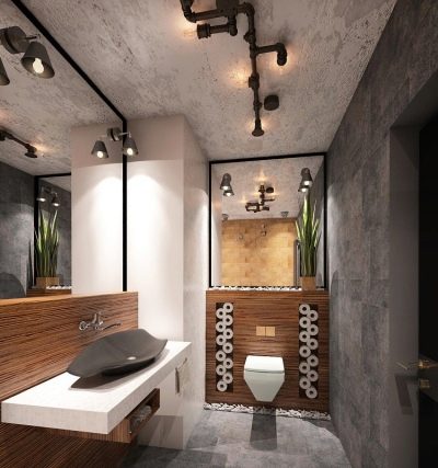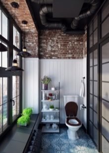 إذا كان المرحاض به نافذة وسقف مرتفع والغرفة فسيحة ، فهذا مجرد حظ. قد يكون هذا الخيار موجودًا في منزل خاص.. سقف من الممكن تزيين الأسقف ذات العوارض الخشبية ، حيث يتم وضع مصباح بالشكل الأصلي ، ينزل على الحبل. الجدران يمكن أن تكون رمادية فقط ، أو ملطخة بالخرسانة ، أو تقليد الطوب أو البناء. الألوان الأساسية – الأسود والأبيض والرمادي والأبيض والبيج والأبيض. وسوف يخفف مثل هذا الداخل لهجة مشرقة. المرحاض الأزرق أو الأخضر جيد لهذا الغرض. ولكن هذا لمحبي الأحاسيس الحية.