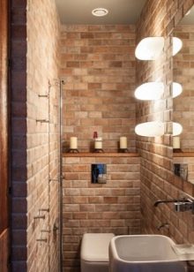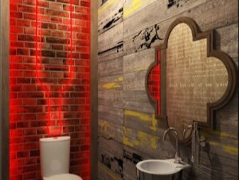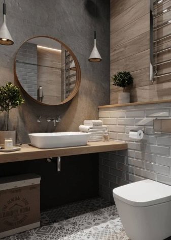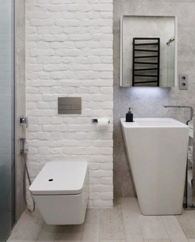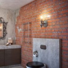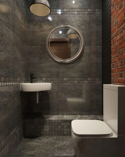 - المصابيح والمرآة الأصلية هي لمسة مشرقة للتصميم. يتم تخفيف اللون الرمادي الرئيسي بجدار واحد من الطوب.