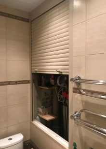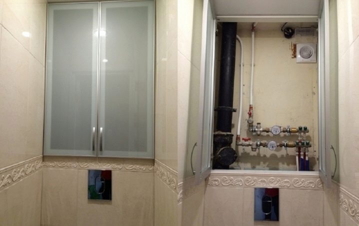 في الداخل ، يتم إخفاء كل شيء بالخشب الرقائقي أو ألواح الجبس أو اللوح الرقائقي. شاشات من هذا النوع بها ثقوب تكنولوجية لخراطيم تصريف المياه. اعتمادًا على اختيار خيار تصميم معين ، يمكن شراء مصاريع دوارة أو أبواب جاهزة. بالإضافة إلى ذلك ، يمكن أن تكون واجهات الخزانات الفنية أثاثًا (ليس فقط متأرجحًا ، ولكن أيضًا يشبه المقصورة).